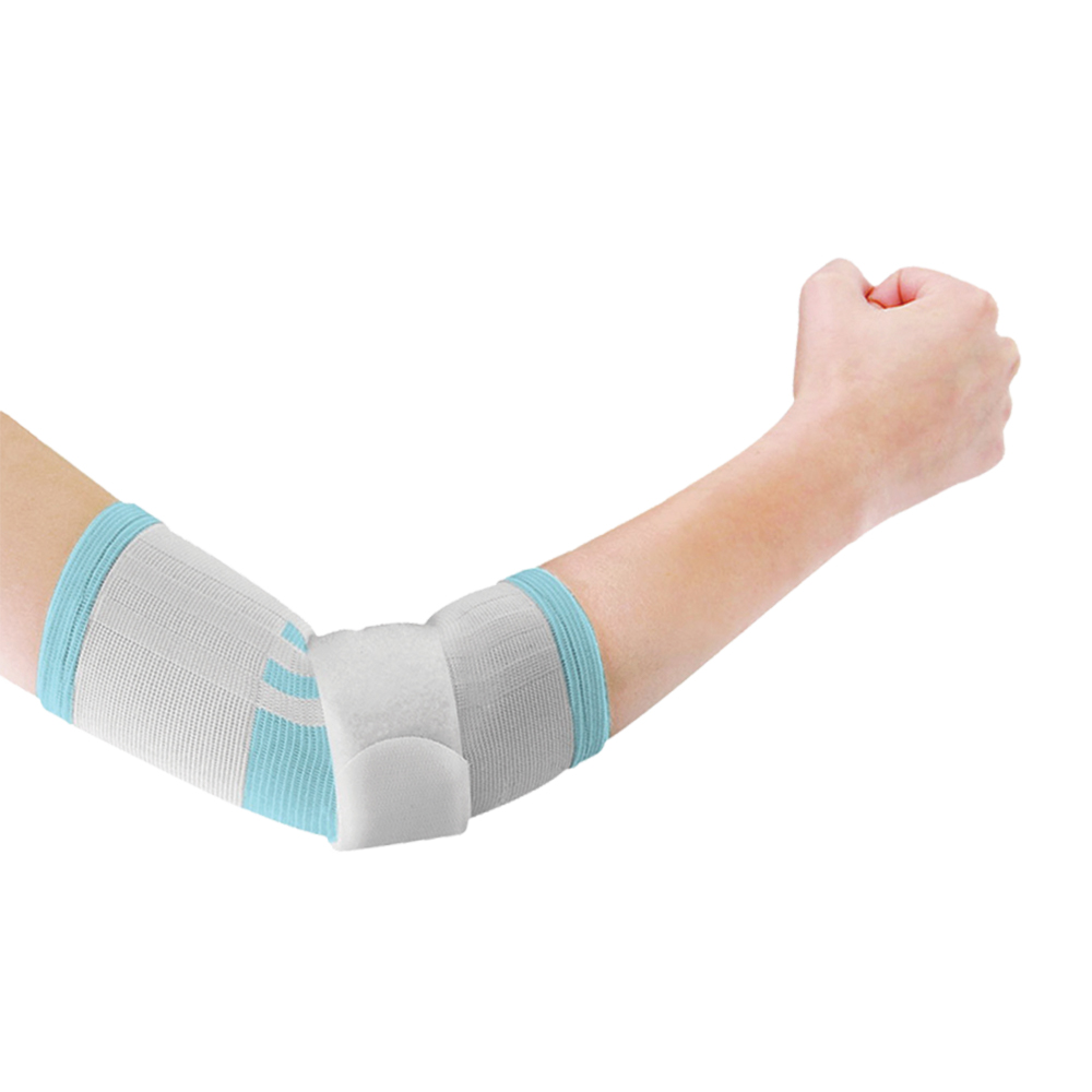Αγκωνίδα από ελαστικό υλικό, υψηλής αντοχής, με πίεστρο σιλικόνης για ανακούφιση από τον πόνο. Αυτοκόλλητη δέστρα στην περιοχή των κονδύλων. Παρέχει ομοιόμορφη συμπίεση στα μαλακά μόρια και στους ιστούς.