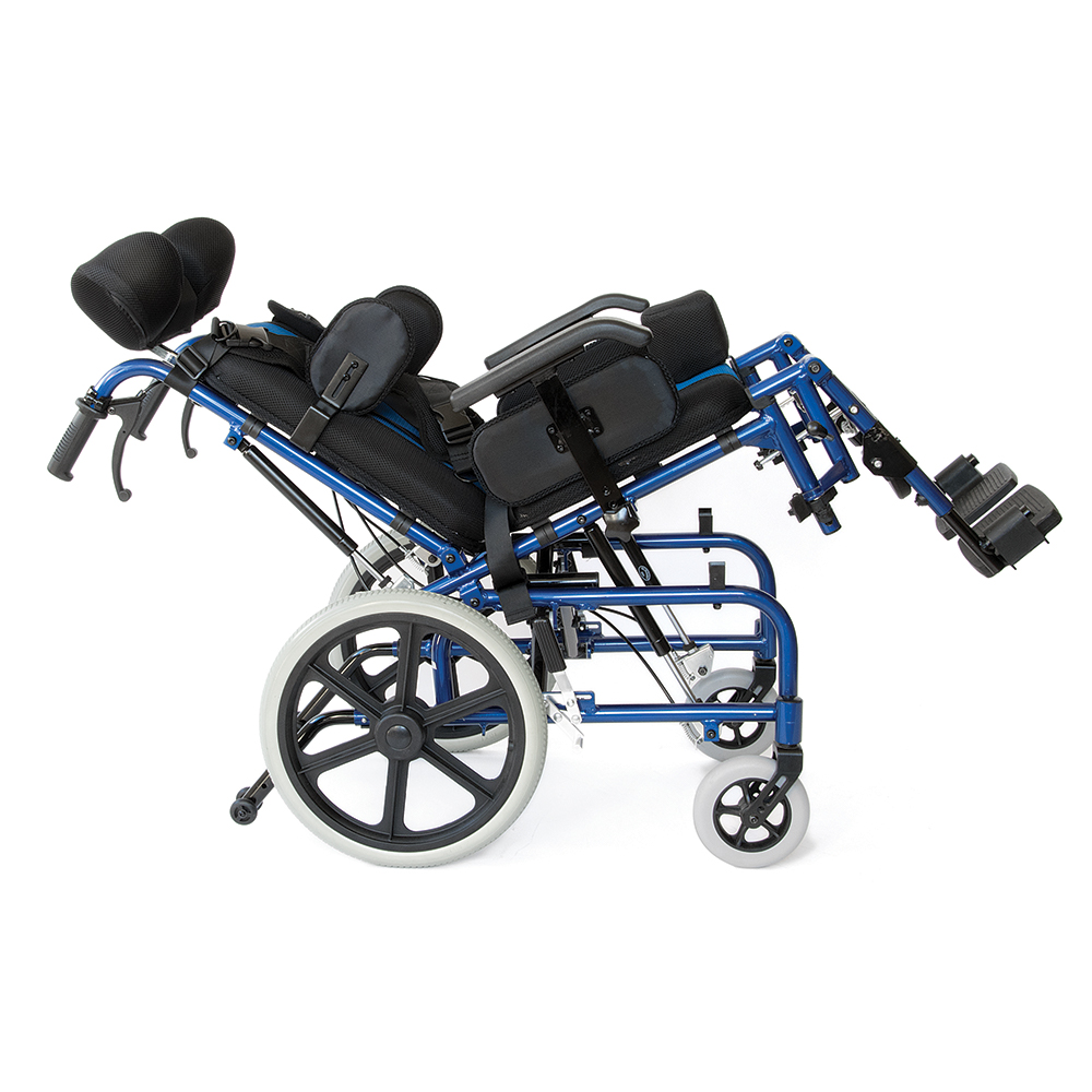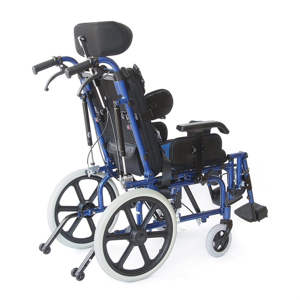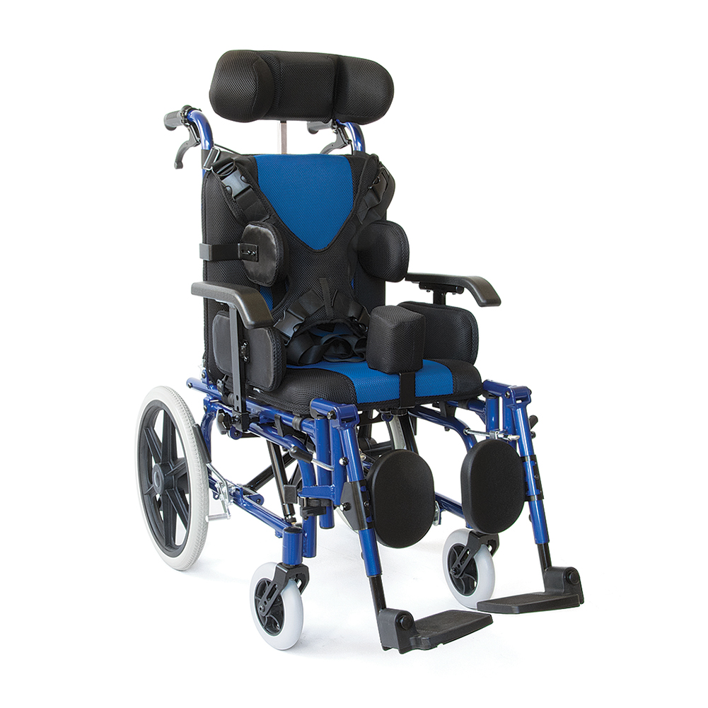 Σκελετός αλουµινίου. Ανακλινόµενη πλάτη µε υδραυλικό σύστηµα. Ανατοµικό, εύκαµπτο στήριγµα κεφαλής ρυθµιζόµενο καθ’ ύψος και διαµορφούµενο. Αφαιρούµενα πλαϊνά. Αφαιρούµενα και ανακλινόµενα υποπόδια. Ρυθµιζόµενη γωνία (“tilt”) καθίσµατος. Φρένα συνοδού και φρένα στους πίσω τροχούς. Ζώνη ασφαλείας τριών σηµείων. ∆ιαχωριστικό σκελών στο κάθισµα. Πίεστρα ακινητοποίησης πλευρών. Υποβραχιόνια ρυθµιζόµενα σε ύψος και πλάτος. Ανατοµικά µαξιλάρια στήριξης γάµπας. Ροδάκια “Αntitip”. ∆ιατίθεται σε δύο µεγέθη.