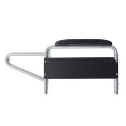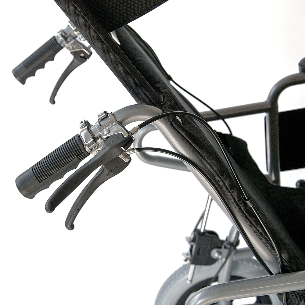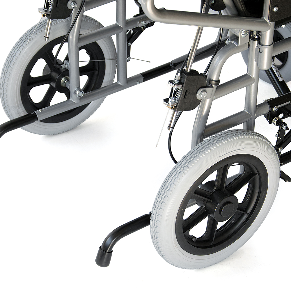 Κατασκευή από µεταλλικό σκελετό ακρυλικής βαφής. Αφαιρούµενα πλαϊνά στήριξης, αφαιρούµενα και ανακλινόµενα υποπόδια µε µαξιλαράκια ανάπαυσης. Υψηλή ανακλινόµενη πλάτη, ρυθµιζόµενη σε θέσεις επιλογής µε προσθαφαιρούµενη προέκταση και αυτοκόλλητο µαξιλάρι. Eπένδυση πλάτης και καθίσµατος από µαλακή ταπετσαρία. Φέρει φρένα συνοδού και ζώνη ασφαλείας.