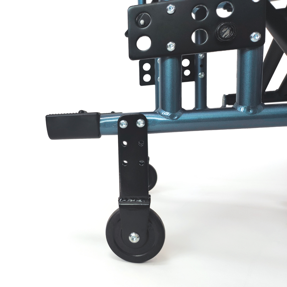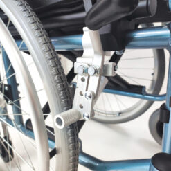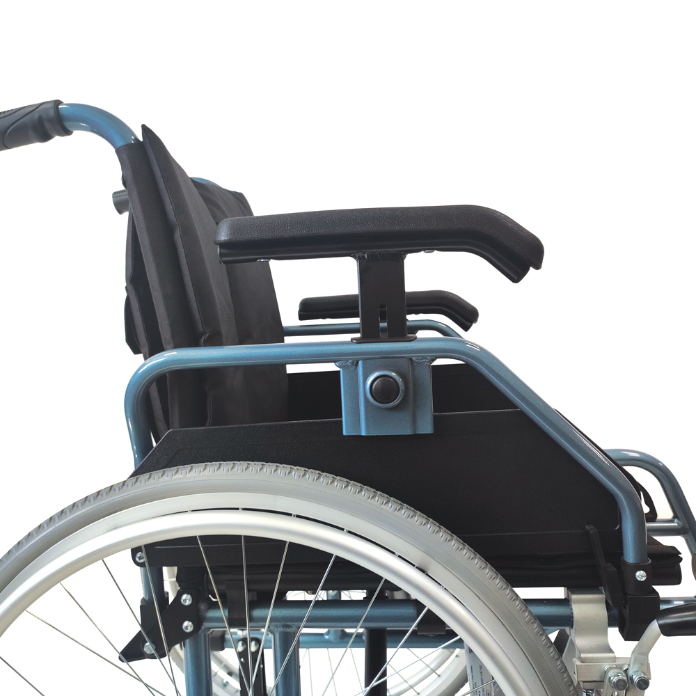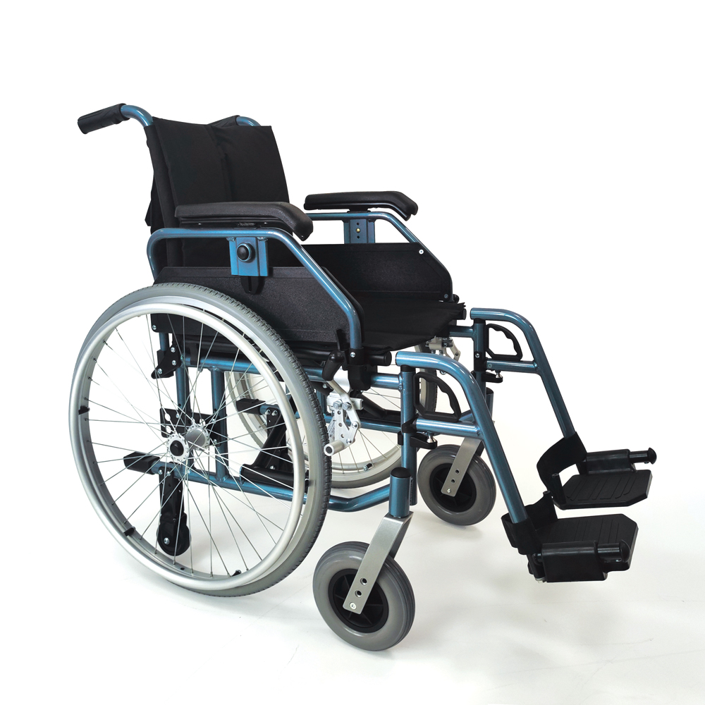 Ενισχυµένο µε διπλά ψαλίδια για περισσότερη αντοχή και σταθερότητα. Ανακλινόµενα πλαϊνά τύπου «Flip Up» µε ρυθµιζόµενα υποβραχιόνια σε ύψος. Oπίσθιοι «Quick Release» τροχοί και ενσωµατωµένοι βοηθητικοί τροχοί για εύκολη µεταφορά σε εσωτερικούς χώρους. Σκελετός αλουµινίου – blue ηλεκτροστατικής βαφής. Πτυσσόµενο. Φέρει ενισχυµένα φρένα στους οπίσθιους τροχούς.