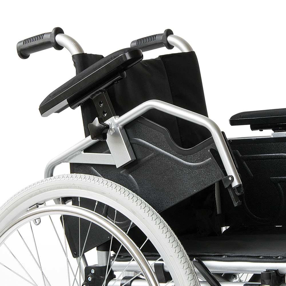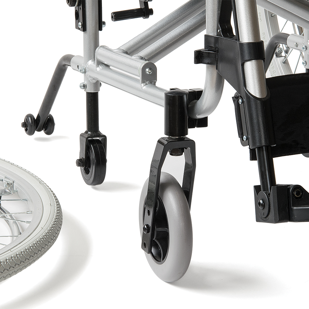 Πτυσσόµενο αµαξίδιο, από αλουµίνιο ελαφρού τύπου. Ενισχυµένο µε διπλά ψαλίδια για περισσότερη αντοχή και σταθερότητα. Πλαϊνά τύπου “Flip Up” µε ρυθµιζόµενα υποβραχιόνια σε ύψος. Αφαιρούµενα υποπόδια µε ρυθµιζόµενη γωνία στήριξης του πέλµατος. Οπίσθιοι “Quick Release” τροχοί. Ενσωµατωµένοι βοηθητικοί τροχοί για εύκολη µεταφορά σε εσωτερικούς χώρους. Ροδάκια “Antitip”.