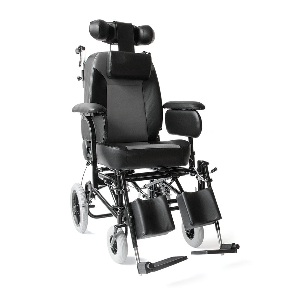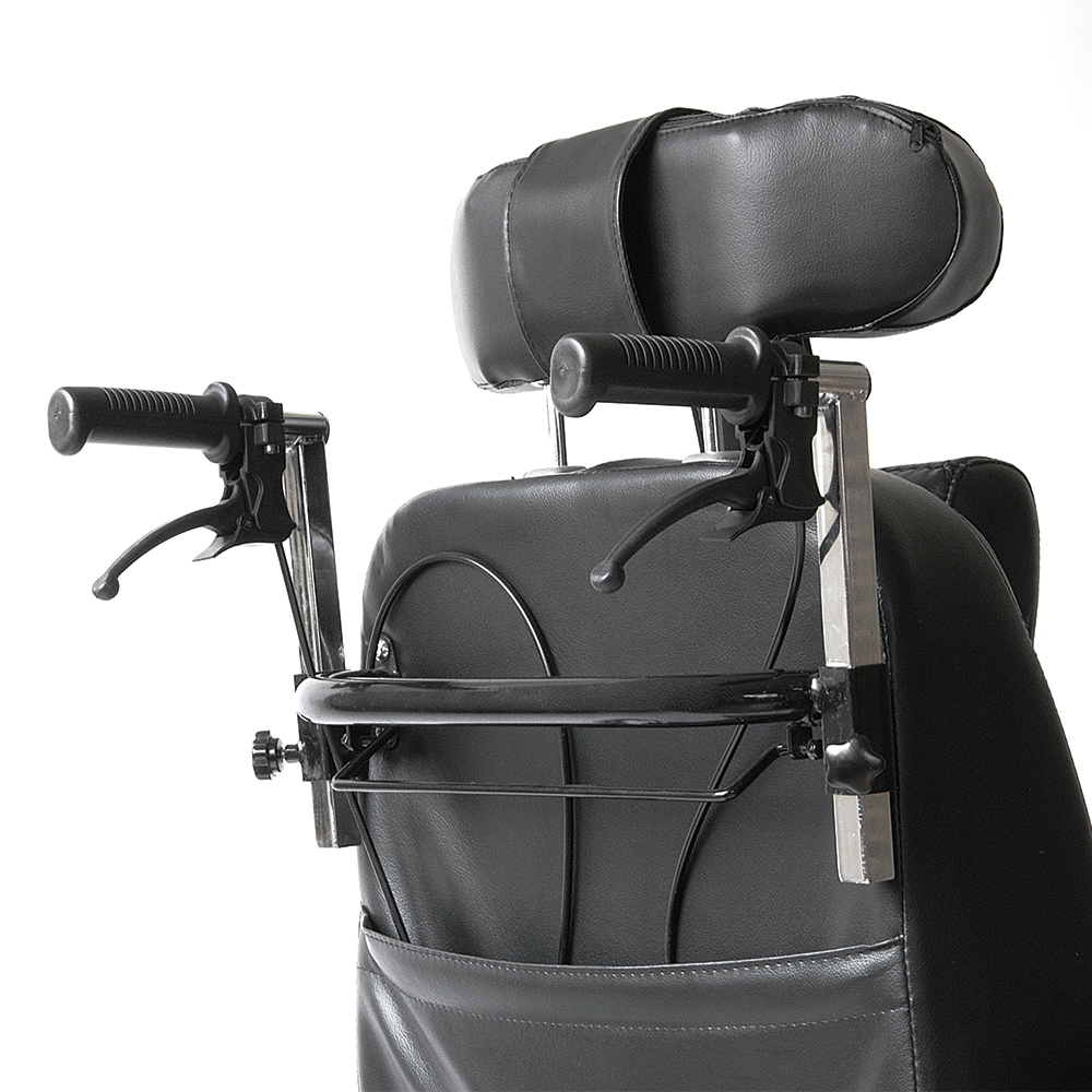 Μεταλλικός σκελετός ηλεκτροστατικής βαφής (“powder coating”). Ανακλινόµενη πλάτη, ρυθµιζόµενη και προσθαφαιρούµενη βάση στήριξης κεφαλής. Ανατοµικό µαξιλάρι αυχένα. Ρυθµιζόµενη γωνία (“tilt”) καθίσµατος και υποβραχιόνια ρυθµιζόµενου ύψους. Aνακλινόµενα και προσθαφαιρούµενα υποπόδια µε µαξιλαράκια στήριξης της γάµπας. Φρένα συνοδού. Mοχλός ρύθµισης θέσης καθίσµατος. Ροδάκια “Antitip”.