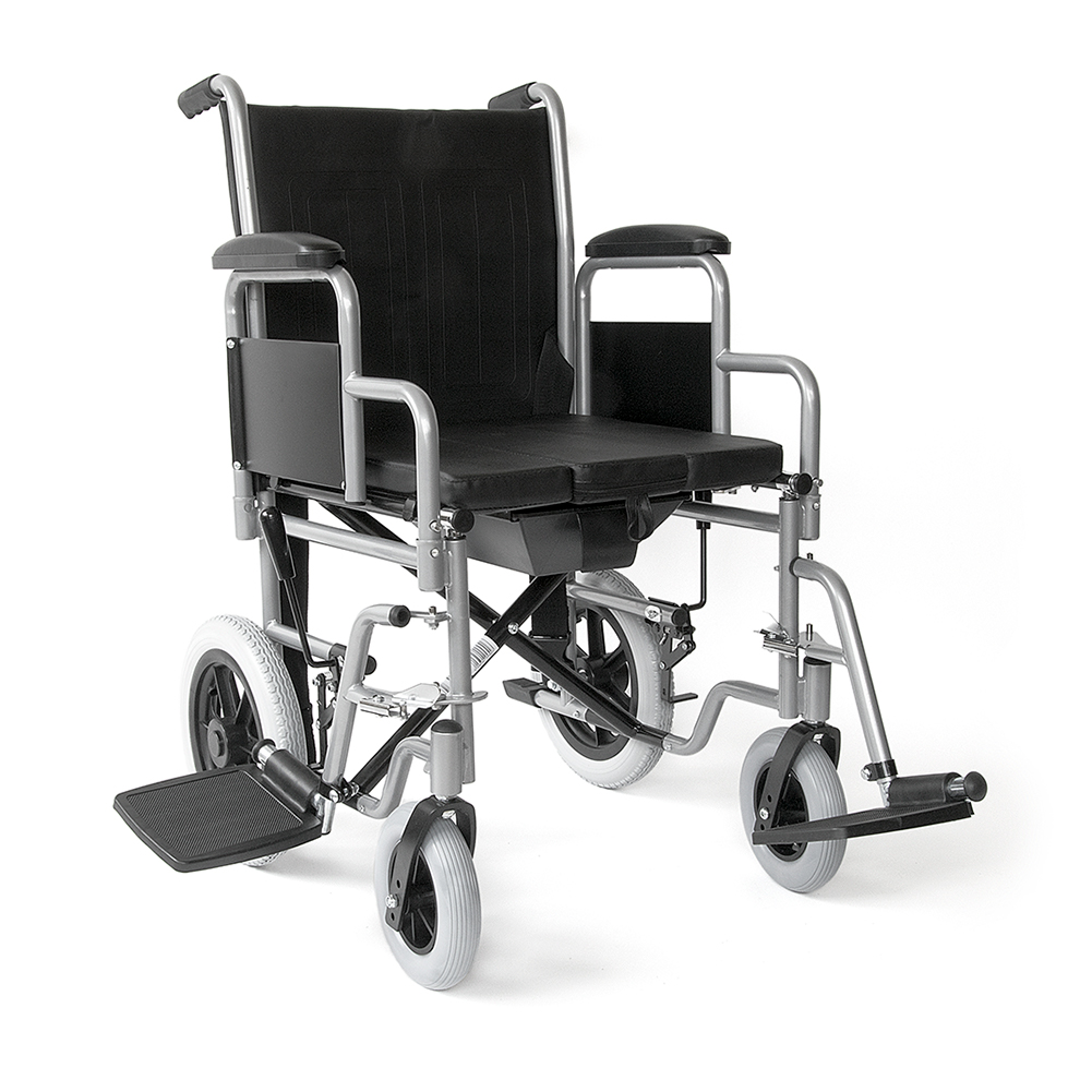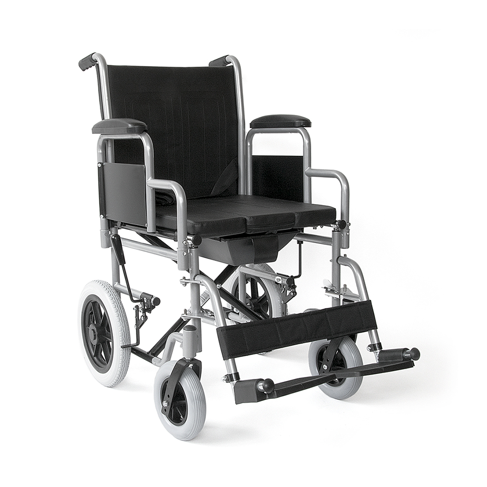 Αναπηρικό αµαξίδιο µεταφοράς πτυσσόµενο, µε δοχείο WC και προσθαφαιρούµενο κάλυµµα οπής. Αφαιρούµενα πλαϊνά και υποπόδια. Φέρει ζώνη ασφαλείας. Η επένδυση του καθίσµατος είναι αδιάβροχη.