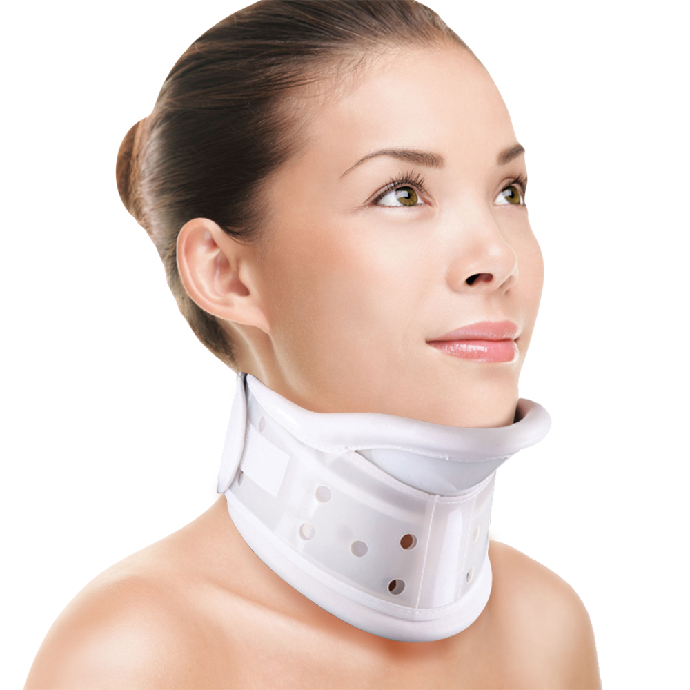 Κολάρο δυο τεμαχίων από πολυαιθυλένιο με οπές αερισμού. Αφρώδες μαξιλάρι στήριξης της κάτω γνάθου. Φινίρισμα από μαλακό αφρώδες υλικό foam, επενδεδυμένο με δερματίνη. Ρυθμιζόμενο καθ’ ύψος με velcro. Οπίσθιο αυτοκόλλητο κλείσιμο. Ακτινοδιαπερατό. Χρώμα: Λευκό
