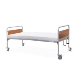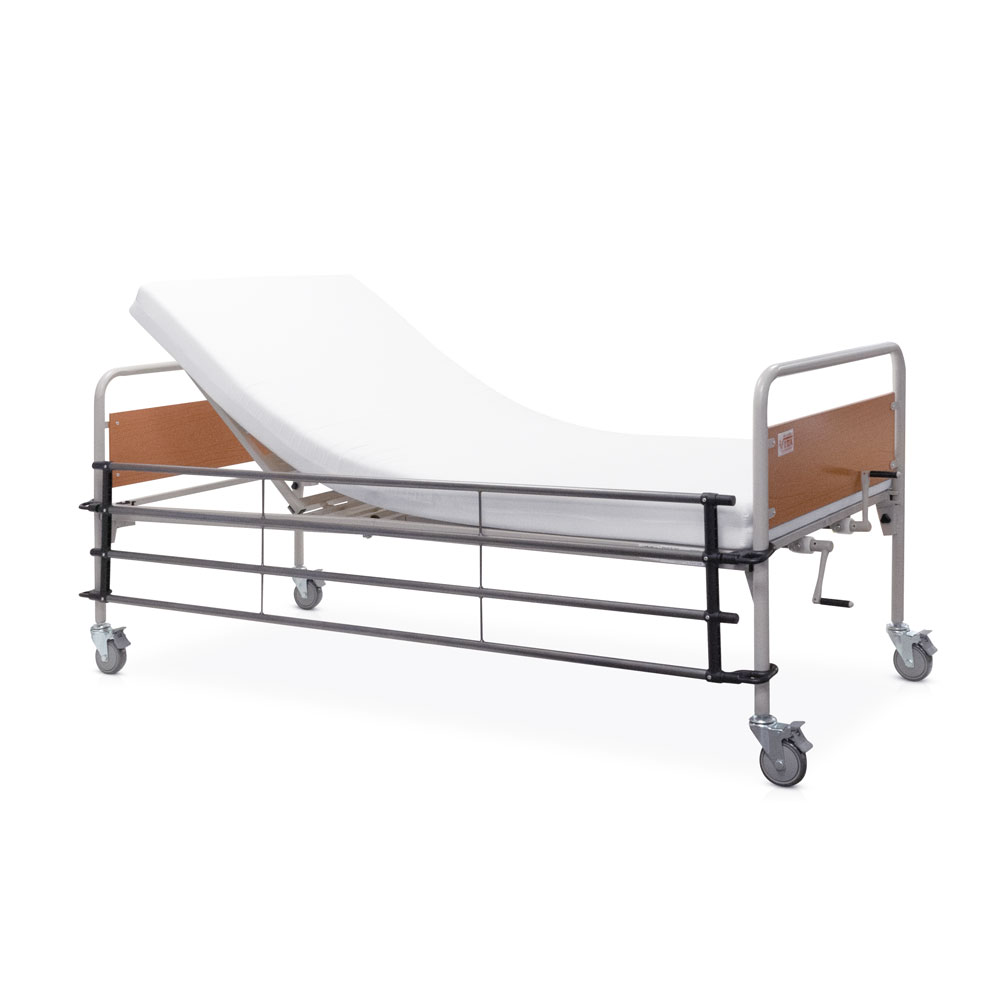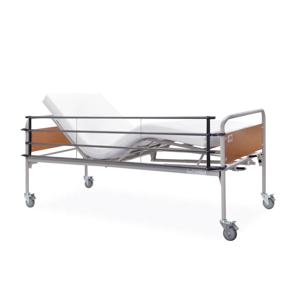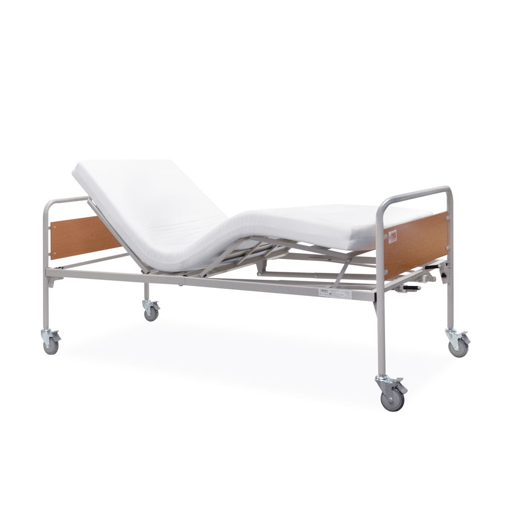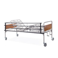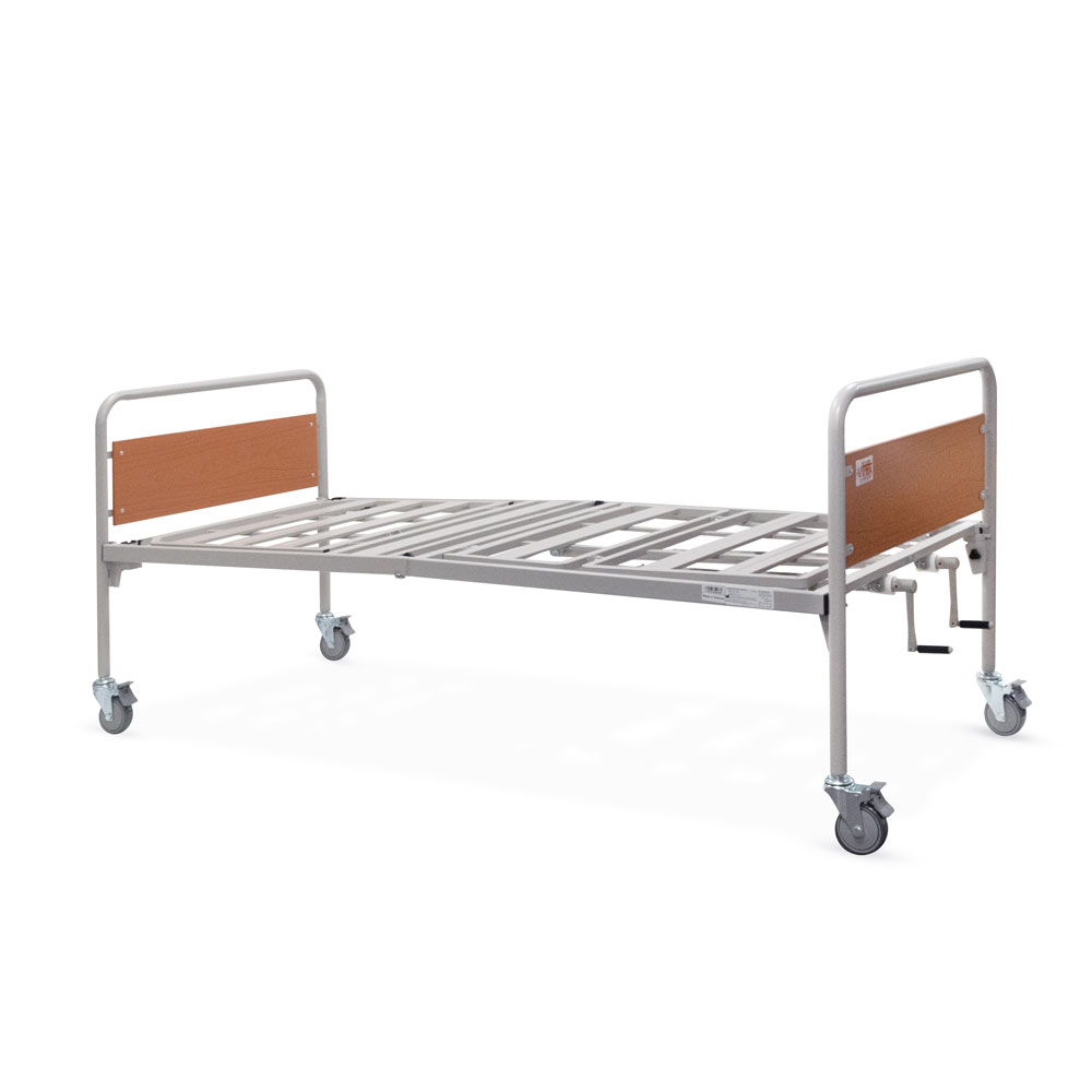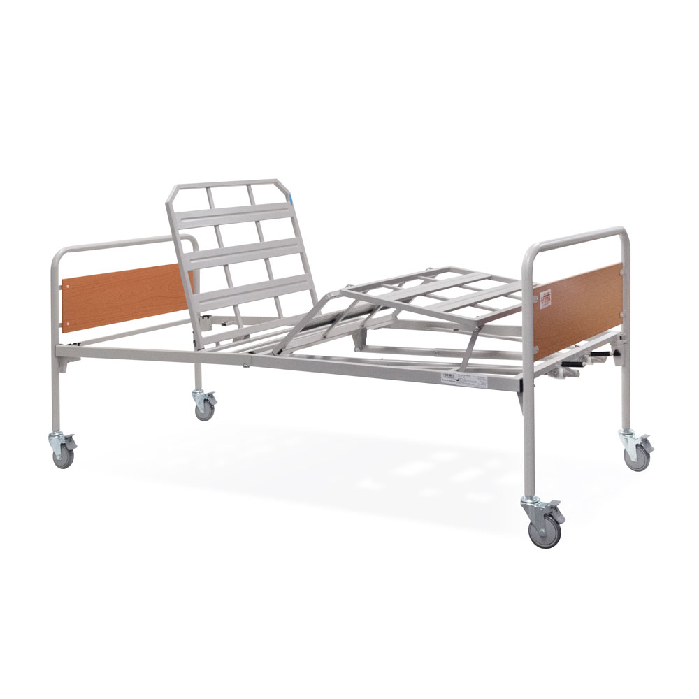 Κλίνη µε δύο µανιβέλες ανύψωσης του κορµού και των κάτω άκρων του ασθενή. Βαρέως τύπου µεταλλική κατασκευή, ακρυλικής βαφής. Σοµιέ, δύο τεµαχίων µε πλέγµα. Μετώπες µε πάνελ φορµάικας. Φέρει δύο µανιβέλες εκ των οποίων η µία εφαρµόζει µε τηλεσκοπικό µηχανισµό. Οι λαβές είναι σπαστές προς αποφυγή τραυµατισµού. Εύκολη µεταφορά στο χώρο, χάρη στους τέσσερεις τροχούς (µε φρένα), οι οποίοι ασφαλίζουν ανεξάρτητα. Τέσσερεις µεταλλικές υποδοχές σταθεροποίησης του στρώµατος.
