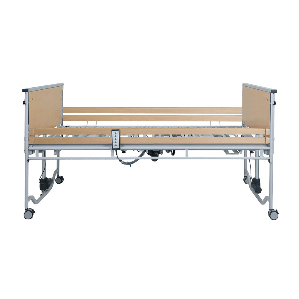 Πολύσπαστη ηλεκτρική κλίνη, µε εσωτερική επένδυση ξύλου στις µετώπες. Μεταλλικό σοµιέ µε µπάρες υποδοχής του στρώµατος. Η ανάκλιση της πλάτης και η ανύψωση των κάτω άκρων πραγµατοποιούνται µε ηλεκτρικό χειριστήριο το οποίο κλειδώνει, προς αποφυγή ατυχηµάτων. Το συνολικό ύψος της κλίνης ρυθµίζεται ηλεκτρικά σε θέσεις επιλογής. ∆υνατότητα ανεξάρτητης λειτουργίας των µοτέρ της µετώπης της κεφαλής ή των κάτω άκρων (“Trendelenburg/Anti-Trendelenburg Position”).