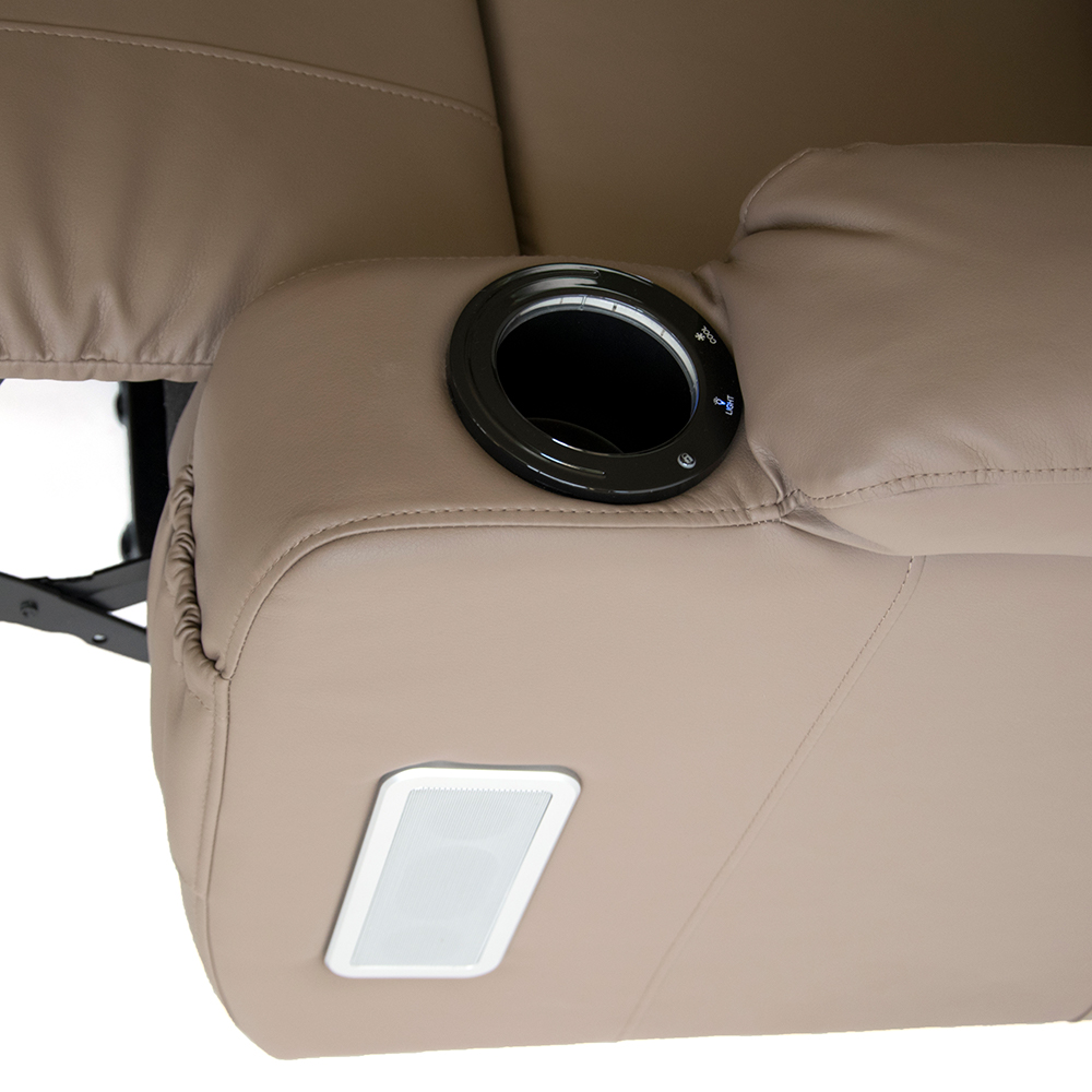 Διαθέτει θέση ποτηριού με ψύκτη και led φωτισμό. Φέρει θύρα bluetooth, βάση στήριξης tablet ή κινητού τηλεφώνου και δύο ηχεία παράπλευρα στο κάθισμα.