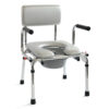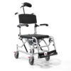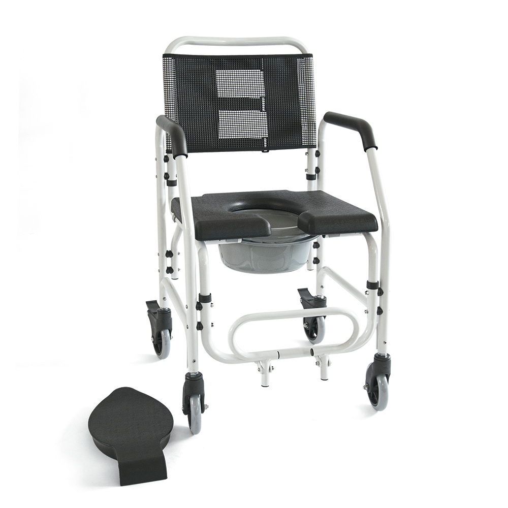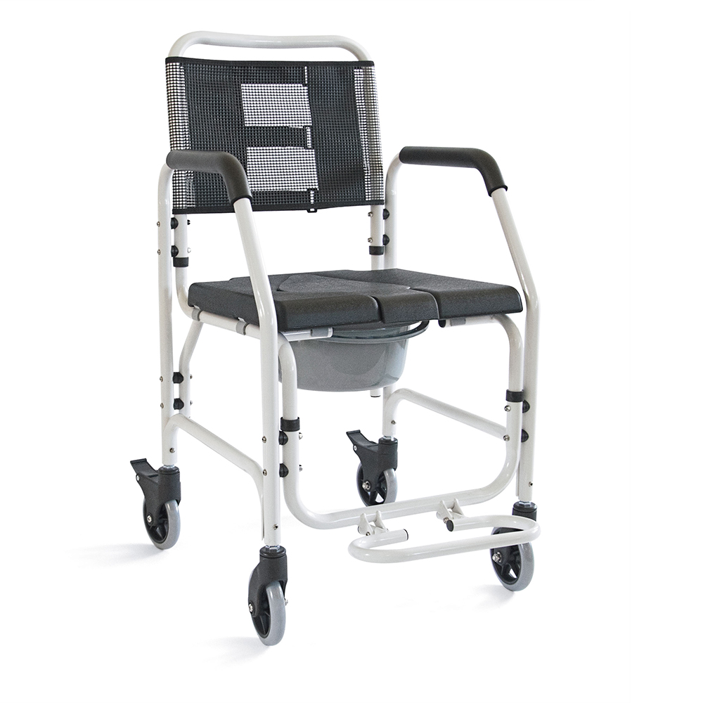 Τροχήλατη καρέκλα µπάνιου από ελαφρύ κράµα αλουµινίου. Αδιάβροχη και σταθερή µε ανακλινόµενο υποπόδιο. Η επένδυση της πλάτης είναι από αεριζόµενο και δικτυωτό “PVC” µε “Velcro” δέστρες εφαρµογής. Το κάθισµα είναι άνετο και µαλακό, από “PU” υλικό. Προσθαφαιρούµενο δοχείο WC µε καπάκι. Οι οπίσθιοι τροχοί έχουν φρένο. Χρώµα λευκό.