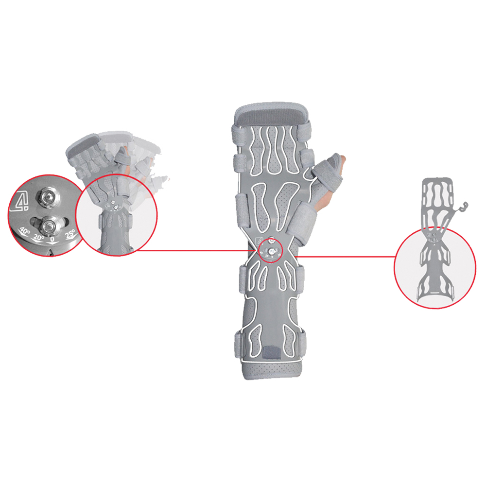 Δυναμικός, λειτουργικός, πηχεοκαρποδακτυλικός νάρθηκας. Διαμορφωμένος σκελετός αλουμινίου. Επενδεδυμένος εξωτερικά με σταθερό υλικό προηγμένης τεχνολογίας “AirSanmed” και εσωτερικά με υποαλλεργικό και αντιεφιδρωτικό βαμβακερό υλικό. Τέσσερις ισχυροί αυτοκόλλητοι και ρυθμιζόμενοι ιμάντες σταθεροποίησης του αντιβραχίου, του καρπού και των δακτύλων. Ο νάρθηκας διαθέτει βοηθητικό αφρώδες εξάρτημα διαχωρισμού δακτύλων για ρευματικές ή νευρολογικές παθήσεις. Μηχανισμός ρύθμισης κερκιδικής ή ωλένιας απόκλισης, σε θέσεις επιλογής -25°, 0°, 20° και 40° (εύρος κίνησης). Η ρύθμιση επιτυγχάνεται με κλειδί allen. Το εξάρτημα διαχωρισμού των δακτύλων είναι προαιρετικό.Διατίθεται σε αριστερό και δεξιό. Χρώμα: Γκρι