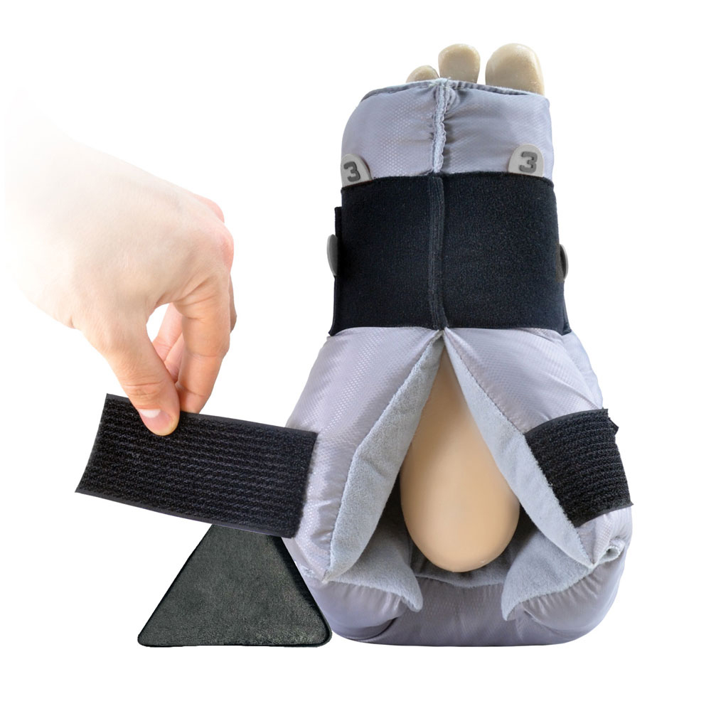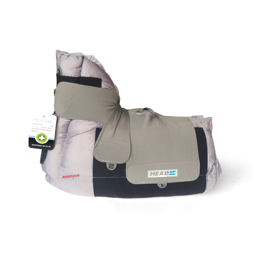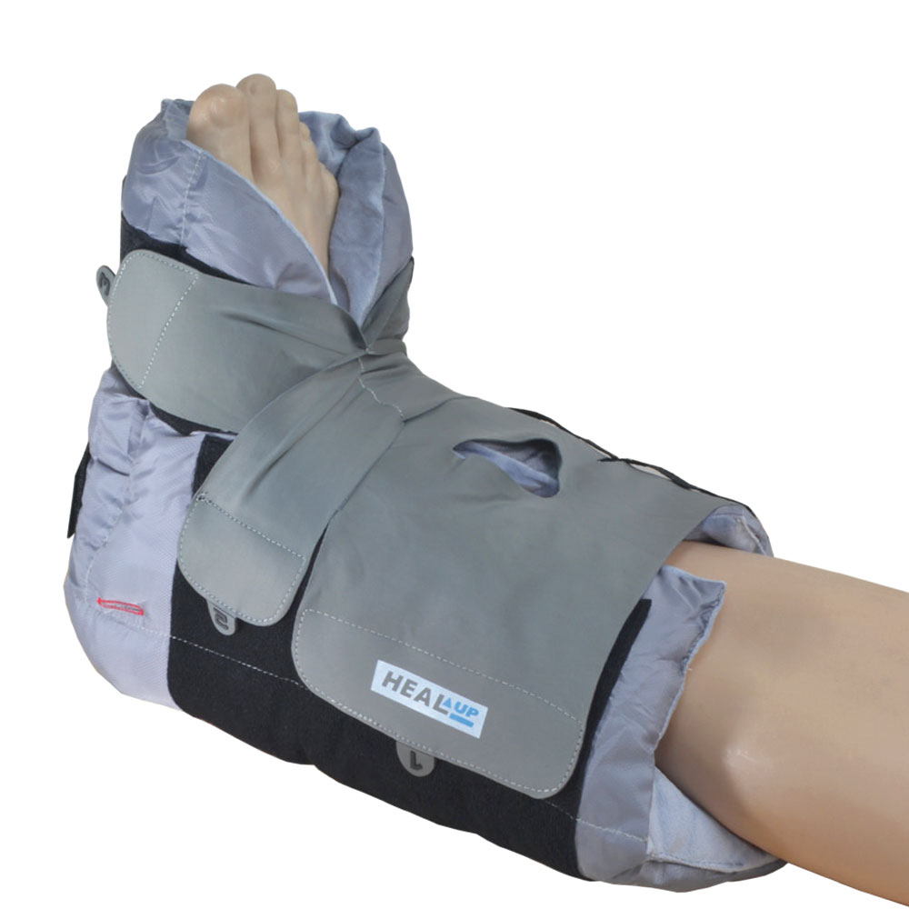 Αποφορτίζει την πτέρνα και περιορίζει το δερματικό έλκος λόγω κατάκλισης. Αυτοκόλλητες ρυθμιζόμενες δέστρες εφαρμογής και περιορισμού της κινητικότητας της ποδοκνημικής άρθρωσης. Ανοιχτή πτέρνα με οπή που επιτρέπει τον οπτικό έλεγχο της πορείας του δερματικού έλκους. Κατασκευή από αντιμικροβιακά υλικά «Agion» και «Silvadur» για τον περιορισμό των βακτηριδίων. Ανατομικές αρθμημένες δέστρες τριών θέσεων (1-2-3) περιορισμού της χαλαρής πτώσης του άκρου ποδός. Περιλαµβάνει τη σφήνα σταθεροποίησης, που µπορεί να προστεθεί στο Heal-Up για την αποτροπή περιστροφής. Αμφιδέξιος.