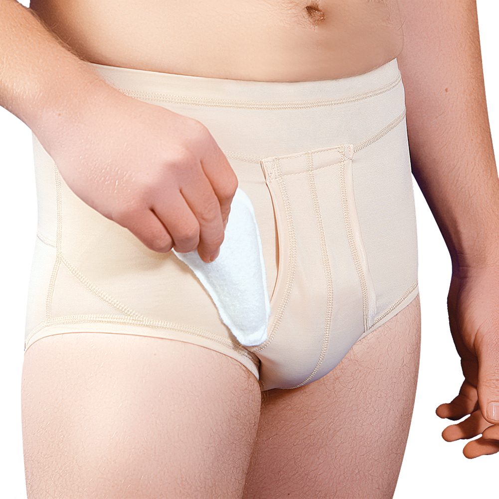 Κατασκευή από επενδεδυμένη lycra με εσωτερικές ειδικές υποδοχές για τις πελότες της κήλης. Φέρει εμπρός οπή. Στη συσκευασία περιλαμβάνονται δύο ανατομικά σχεδιασμένες πελότες. Πλένεται. Χρώμα: Μπεζ